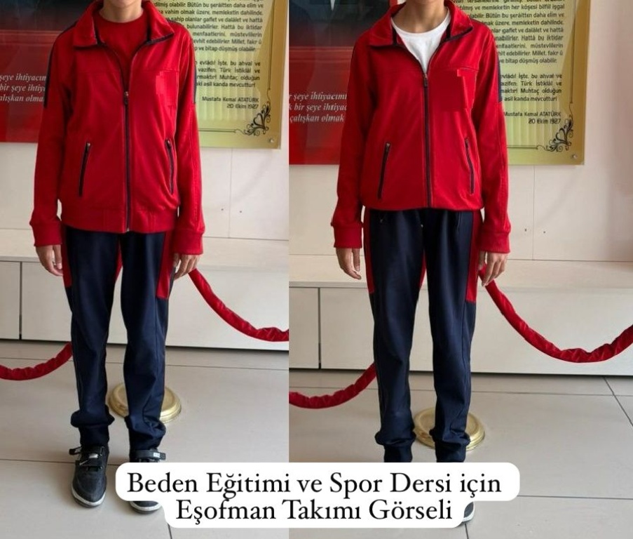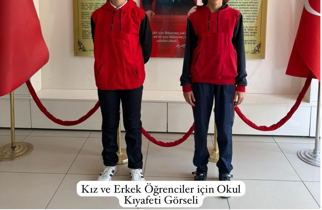 2025-2026 eğitim öğretim yılı için okul kıyafetlerimizde değişiklik yapılmamıştır. Herhangi bir logo veya amblem bulunmamaktadır. Okulumuz öğrencilerinin kıyafetleri aşağıdaki görsellerde yer almaktadır. Okul kıyafetleri istenilen yerlerden temin edinilebilir. Bilindiği üzere okul kıyafeti okul kimliğinin, öğrenci olmanın önemli bir parçasıdır. Öğrenciye aidiyet duygusu kazandırmasının yanında okul ortamının düzenli olmasına da katkı sağlar. Velilerimiz olarak göstereceğiniz hassasiyet için şimdiden teşekkür eder, yeni eğitim öğretim yılının mutluluk, huzur, sağlık ve başarı dolu olmasını temenni ederiz.